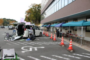 病院のリハビリ職員が熱心にトヨタさんのブースで運転装具についてのお話を聞いています。